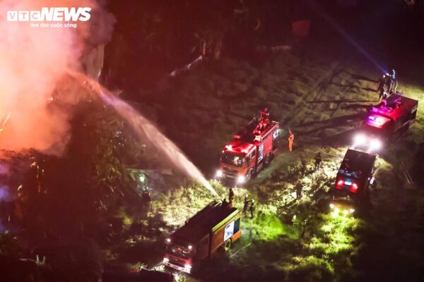 Lực lượng chức năng huy động robot, máy xúc xuyên đêm dập đám cháy kho xưởng 6.000m² đối diện Bệnh viện K Tân Triều (phường Thanh Liệt, Hà Nội).
